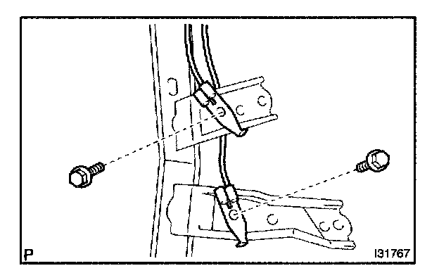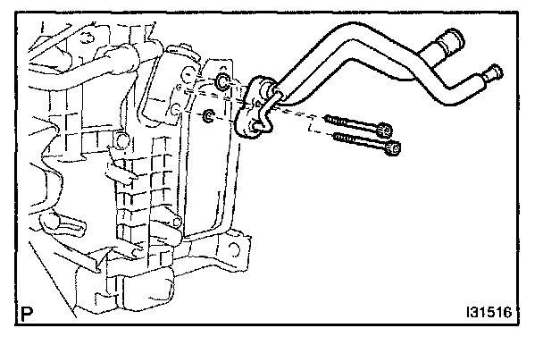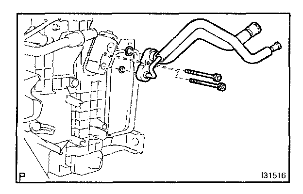 b. Using a hexagon wrench 4 mm (0.16 in.), remove the 2 hexagon bolts and air conditioning tube assembly.