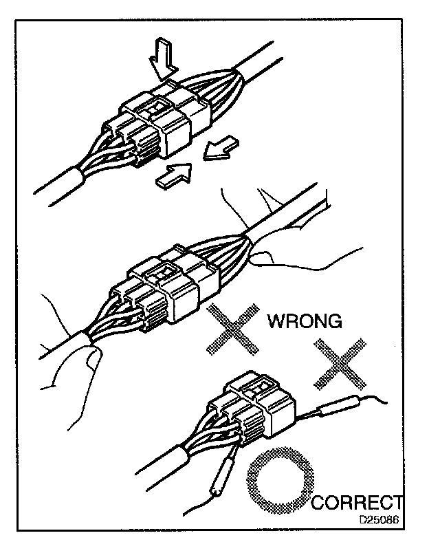 2. When removing the connector, do not hold the harness, but hold the connector.