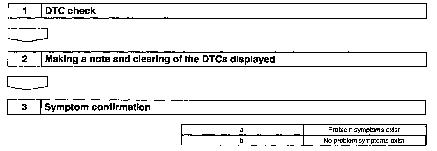- In the DTC check, it is very important to determine whether the problem indicated by the DTC is still occurring or has occurred in the past but returned to normal at present. In addition, it must be checked in the problem symptom check whether the malfunction indicated by the DTC is directly related to the problem symptom or not. For this reason, the DTC should be checked before and after the symptom confirmation to determine the current conditions. If this is not done, it may, depending on the case, result in an unnecessary troubleshooting for normally operating systems, making it more difficult to detect the problem area, or trying to repair irrelevant areas. Therefore always follow the procedure in the correct order and perform the DTC check.
