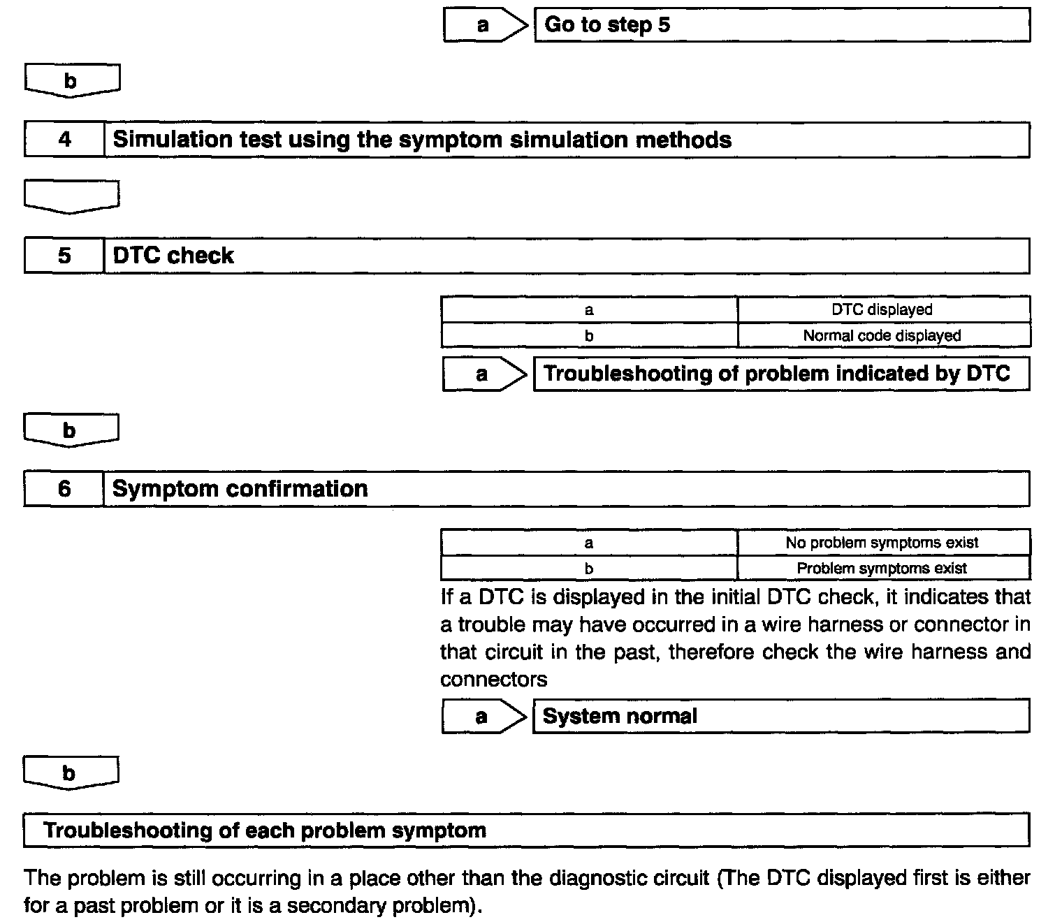 - A flow chart showing how to proceed with the troubleshooting using the diagnostic trouble code (DTC) check is shown. This flow chart shows how to utilize the DTC check effectively. Then, by carefully checking the results, indicates how to proceed either to the DTC troubleshooting or to the troubleshooting of problem symptoms table.