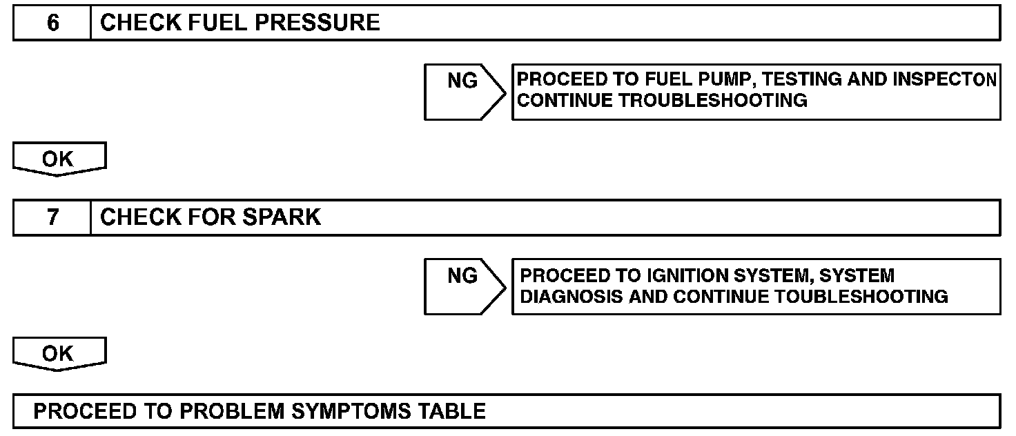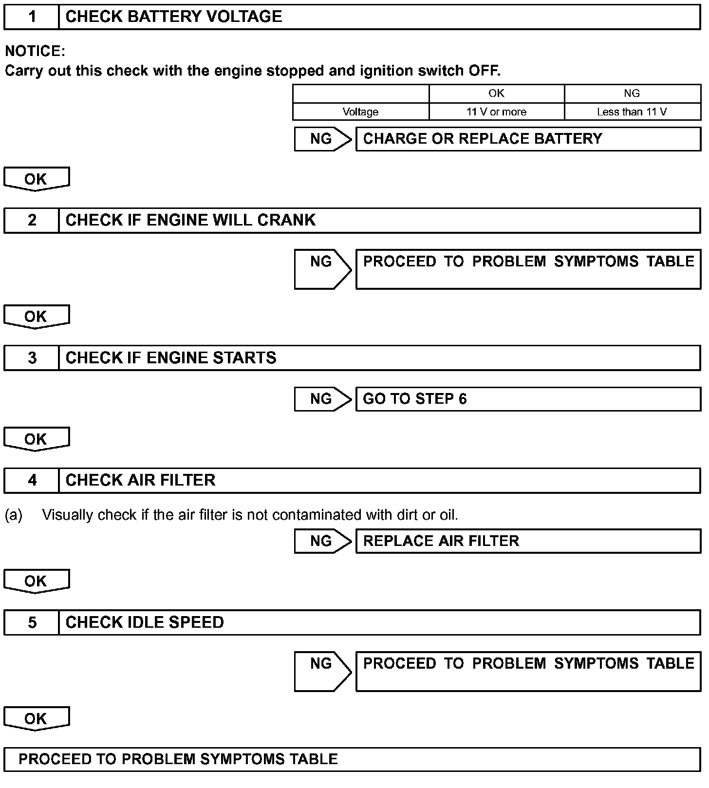 When the malfunction is not confirmed in the DTC check, troubleshooting should be carried out in all the possible circuits considered as causes of the problem. In many cases, by carrying out the basic engine check shown in the flow chart, the location causing the problem can be found quickly and efficiently. Therefore, using this check is essential in the engine troubleshooting.