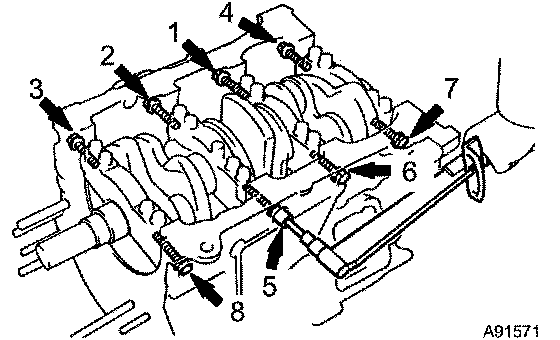n. Uniformly install and tighten the 8 main bearing cap bolts in the sequence shown in the illustration.