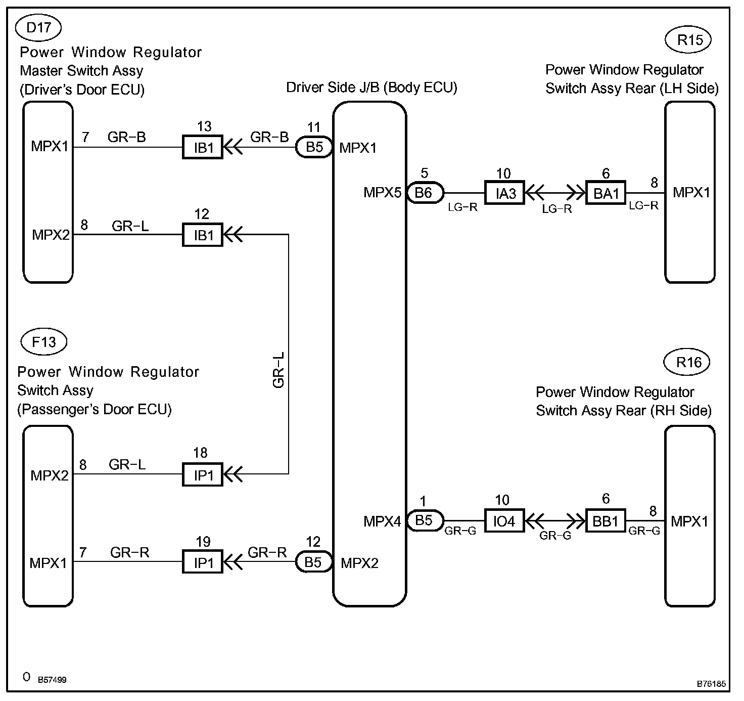 When the ignition switch is ON, the power window regulator master switch (driver's door ECU) send to the power window regulator switch (passenger's door ECU) for multiply a remote switch signal, and then the power window regulator switch (passenger's door ECU) drives the power window motor for the passenger. And the power window regulator master switch (driver's door ECU) send driver side J/B (body ECU) to the rear window regulator switch LH and RH for multiply a remote switch signal, and then the power window regulator switch LH drives the power window motor LH and the power window regulator switch RH drives the power window motor RH.