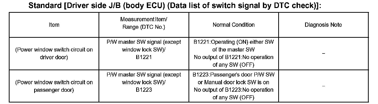 HINT: DTC No. B1221 and B1223 are the codes to inform of each switch condition and will be output when the switch is ON. In that these codes are displayed operating the switch or the switch or the codes are not displayed even with operating the switch, there may be trouble in the switch circuit.