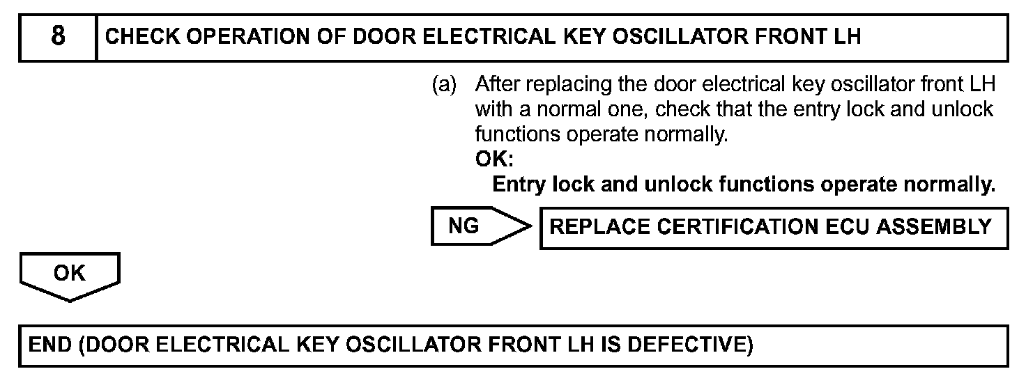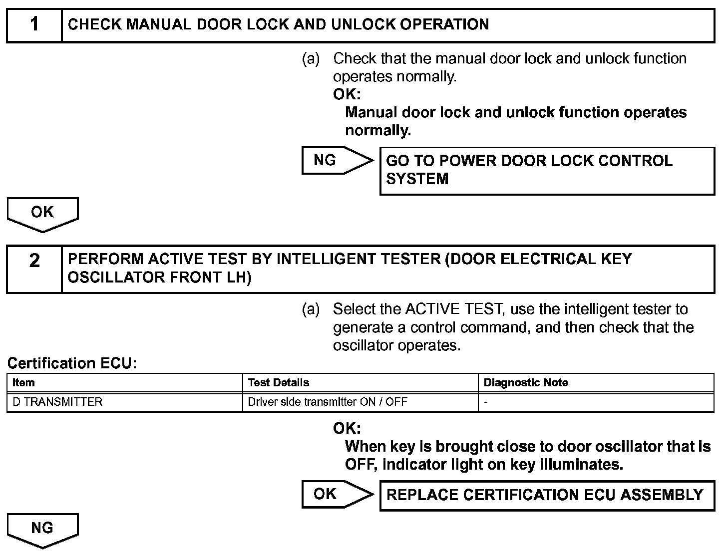 Both the entry lock and unlock functions do not operate when: 1) nothing is output from the door electrical key oscillator front LH, 2) the smart access system with push-button start is disabled through customization, or 3) the entire power door lock control system is malfunctioning.