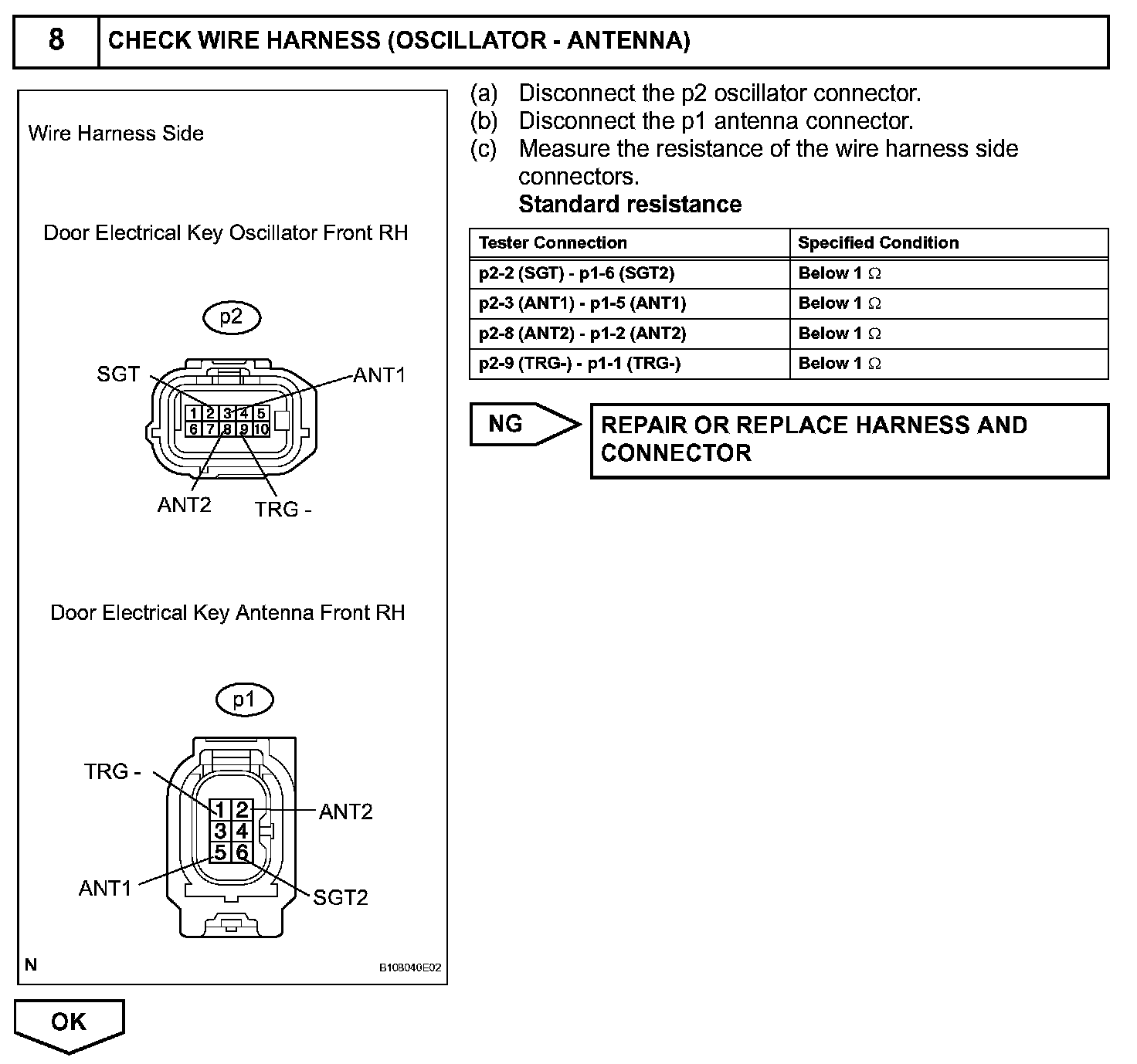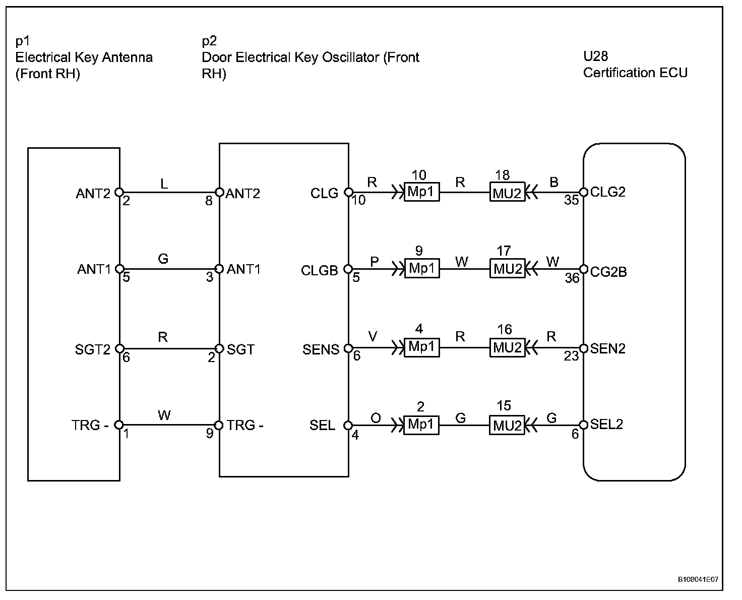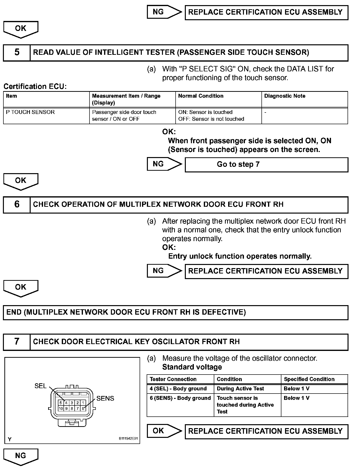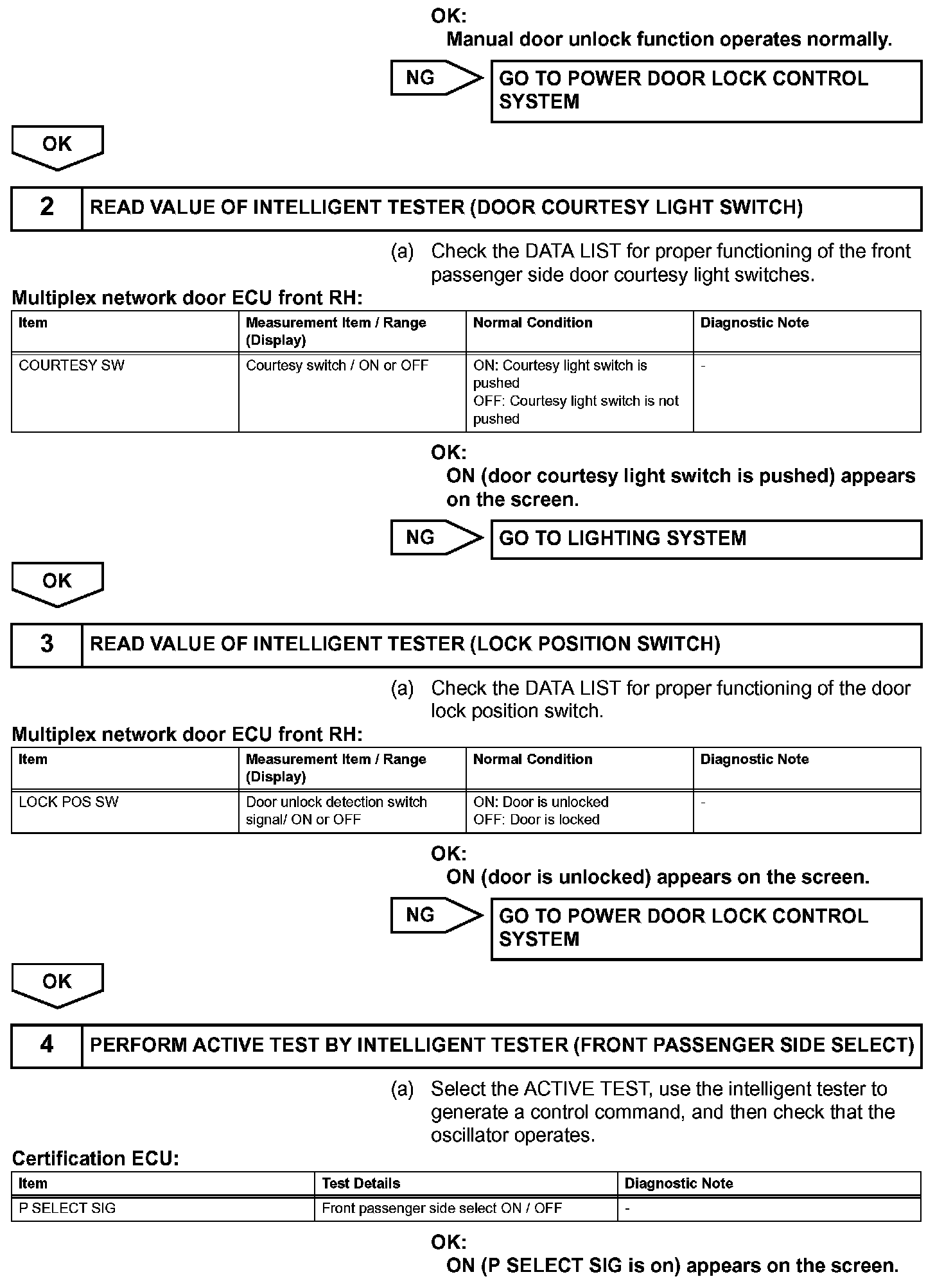 When an ID code from the door electrical key oscillator front RH matches an ID code from the key, the multiplex network door ECU front RH (front passenger door ECU) outputs a SEL signal (Lo when output) to the door electrical key oscillator front RH, activates the touch sensor inside the outside door handle, and enters unlock standby mode. When the touch sensor is touched, the door electrical key oscillator front RH sends a SENS signal (Lo when output) to the multiplex network door ECU front RH (front passenger door ECU) and the multiplex network door ECU front RH (front passenger door ECU) sends unlock signal to the front passenger side door lock.