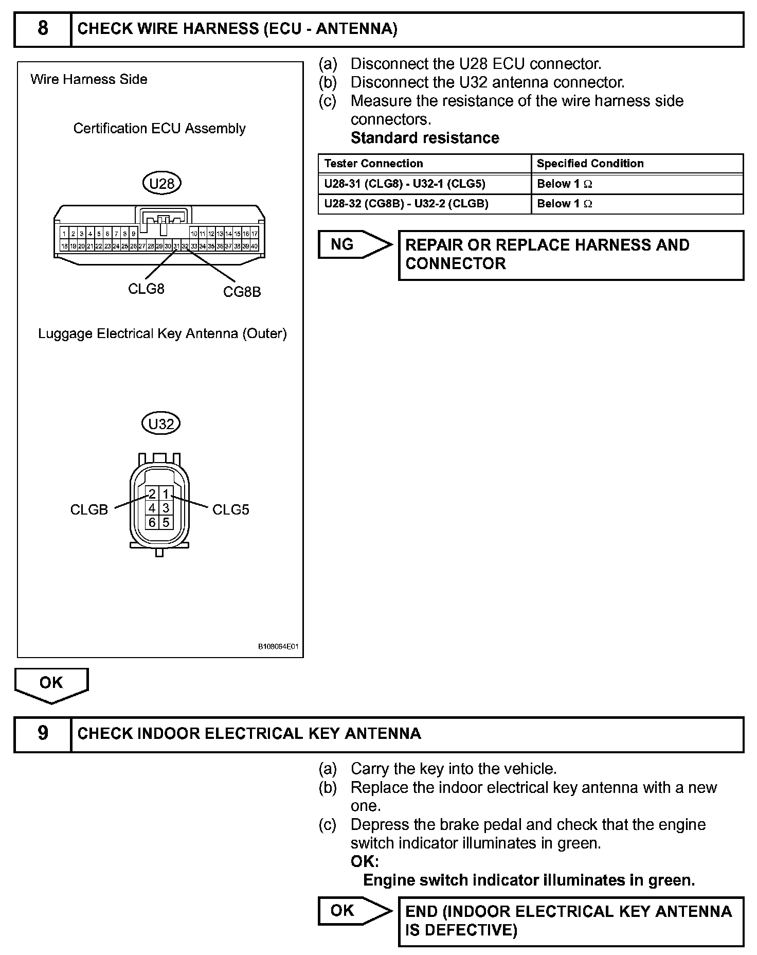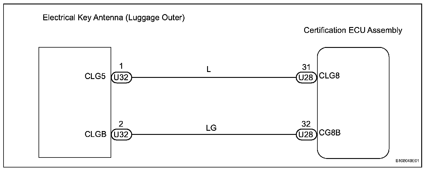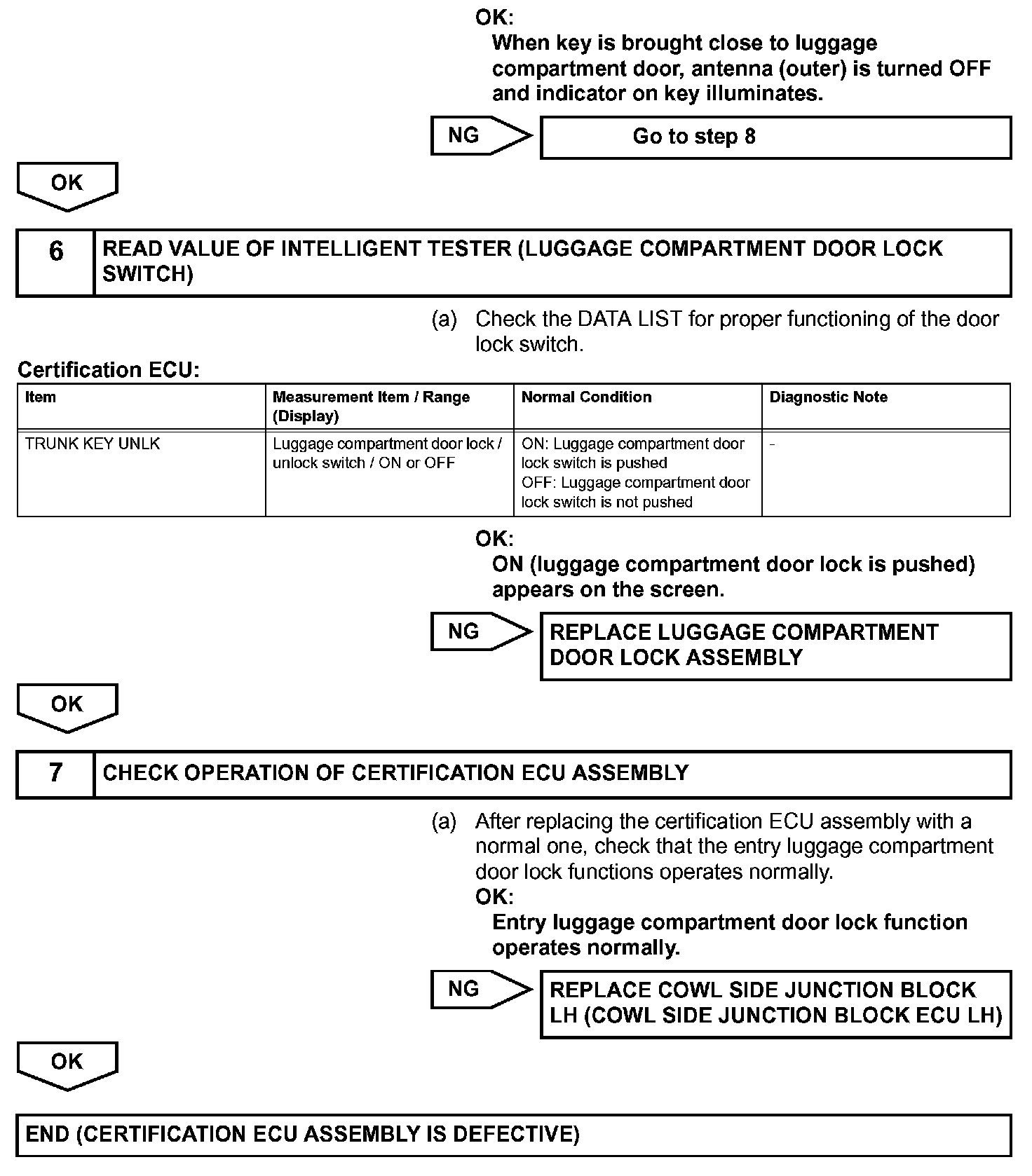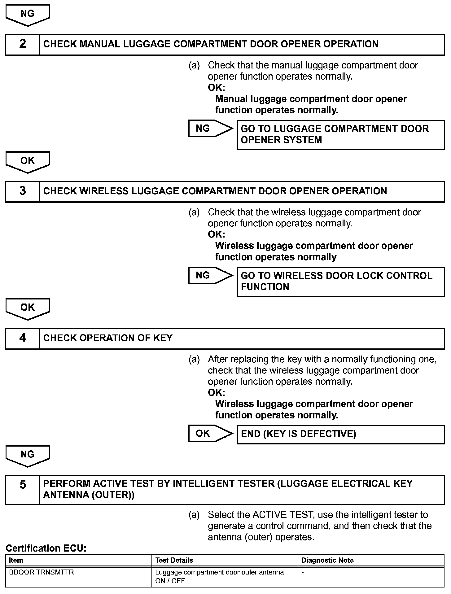 When the power luggage door open switch is turned ON, the certification ECU uses the luggage electrical key antenna (outer) and antenna to output a request signal to the outside of the vehicle for a distance of approximately 1.0 m (3.3 ft) from the luggage compartment door. A key near the luggage compartment door detects this request and transmits its ID code. The entry door control receiver receives the ID code and sends this ID code to the certification ECU. The certification ECU checks if the ID code is valid. When the ID code is valid, the certification ECU sends a luggage compartment door open signal to the cowl side junction block LH (drive side junction block ECU) using the multiplex communication line and stops outputting request signals. The luggage room junction block then unlocks the luggage compartment door.