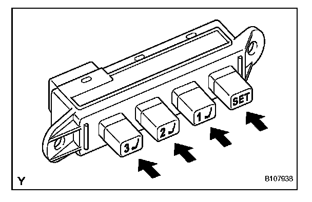 1. With the engine switch off and the driver side door closed, press and hold the M1, M2 or M3 switch. The position control ECU & switch assembly will enter transmitter key recognition code registration mode.
