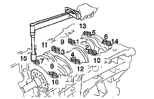 Install and uniformly tighten the 16 main bearing cap bolts in the sequence shown in the illustration.