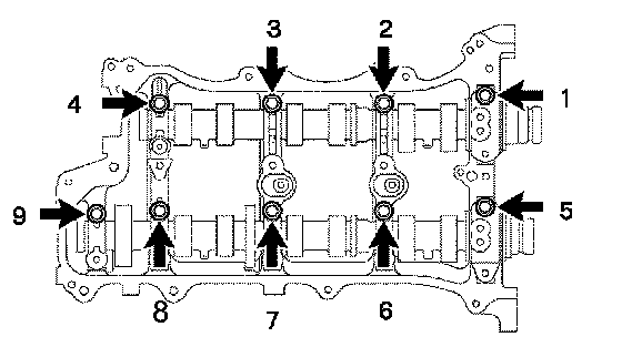 Install and uniformly tighten the 10 cylinder head bolts, and plate washers in the sequence shown in the illustration.