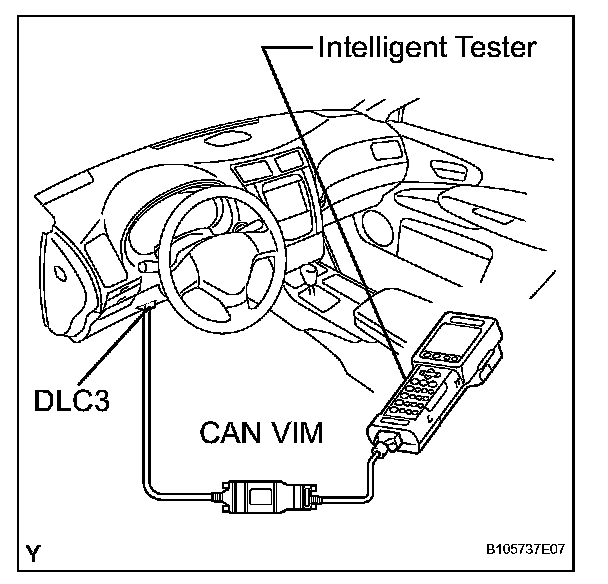 HINT: Connect the cable of the intelligent tester to the DLC3, turn the engine switch on (IG) and attempt to use the tester. If the display indicates that a communication error has occurred, there is a problem either with the vehicle or with the tester.