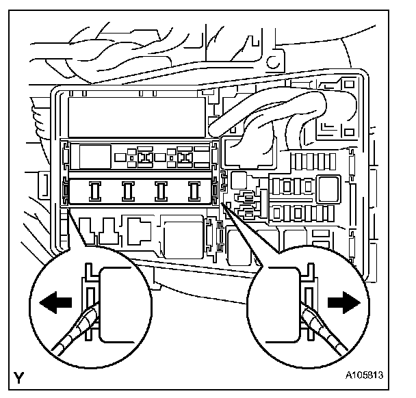 b. Using a screwdriver, detach the 2 claws and disconnect the integration relay from the engine room No. 2 junction block.