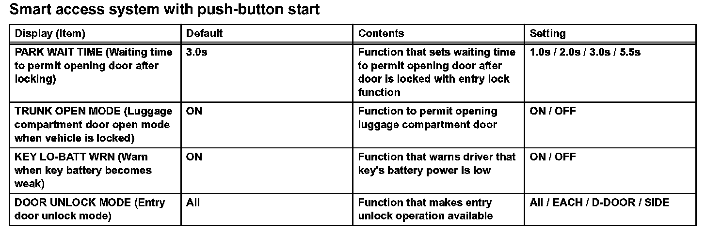 HINT: The function only changes the entry unlock mode of the smart access system with push-button start. It does not switch the unlocking of the wireless door lock control.