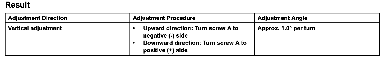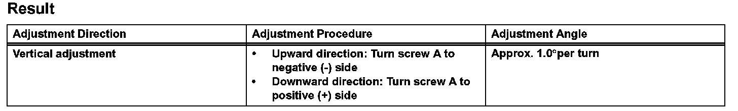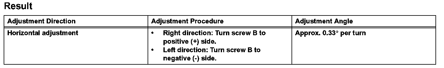 - If "LEFT SIDE: 1.0 degrees" is displayed, the divergence is 1.0 degrees in the left direction. Turn screw B approximately 3 turns to the negative (-) side.