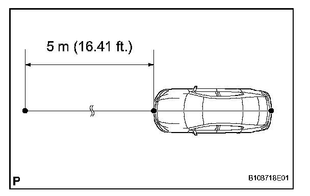 2. Set one end of the 10 m (32.82 ft.) string on the vehicle rear's center point. Run the string over the vehicle front's center point to a position 5 m (16.41 ft.) beyond the vehicle front's center point, as shown in the illustration. Mark the 5 m (16.41 ft.) position.