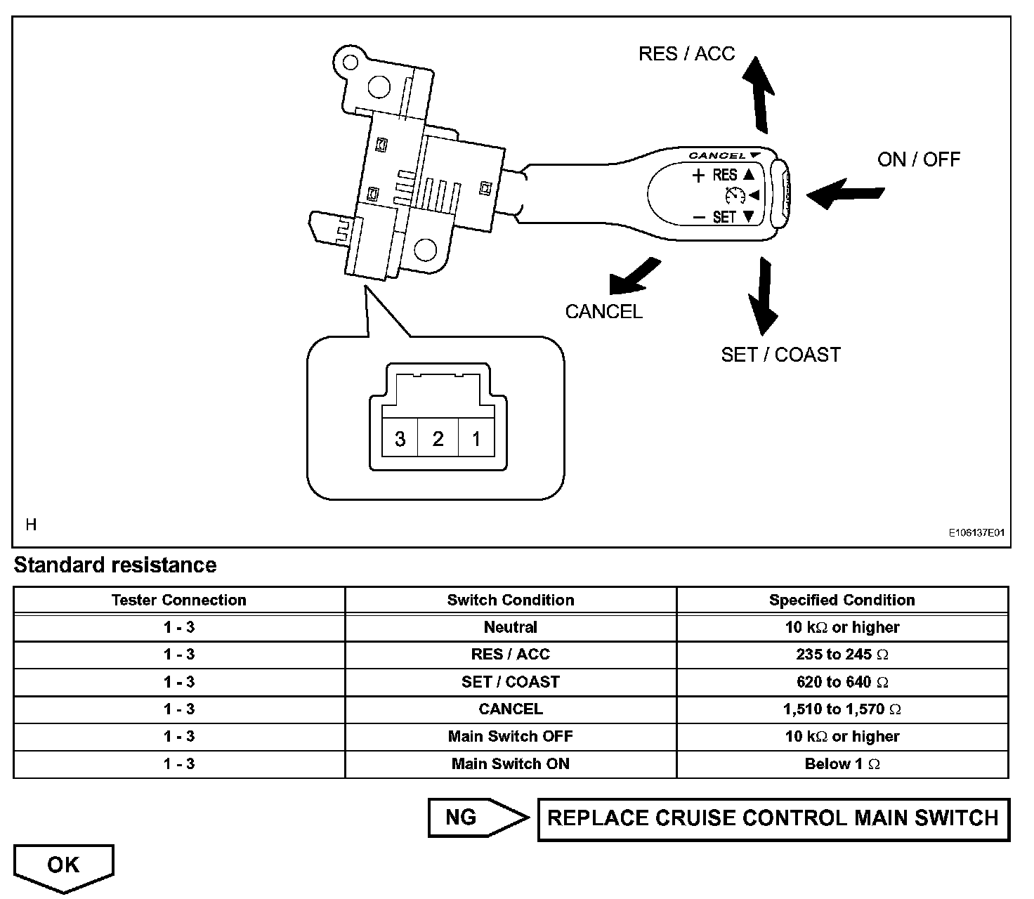 The cruise control main switch operates 7 functions: SET, COAST, TAP-DOWN, RESUME, ACCEL, TAP-UP, and CANCEL. The SET, TAP-DOWN and COAST functions, and the RESUME, TAP-UP and ACCEL functions are operated with the same switch. The cruise control main switch is an automatic return type switch which turns on only while operating it in each arrow direction and turns off after releasing it. The internal contact point of the cruise control main switch is turned on with the switch operation. Then the ECM reads the resistance value that has been changed by the switch operation to control SET, COAST, RESUME, ACCEL and CANCEL.