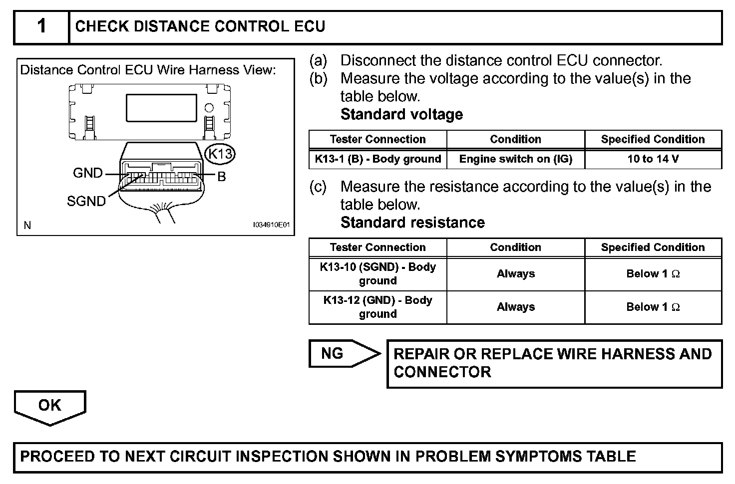 This circuit provides power to operate the distance control ECU (cruise control ECU). The distance control ECU determines information about the vehicle in front based on data from the radar sensor, and then decides how much acceleration and / or deceleration is needed to maintain the set distance. The distance control ECU also requests the skid control ECU to apply braking and sound the buzzer.