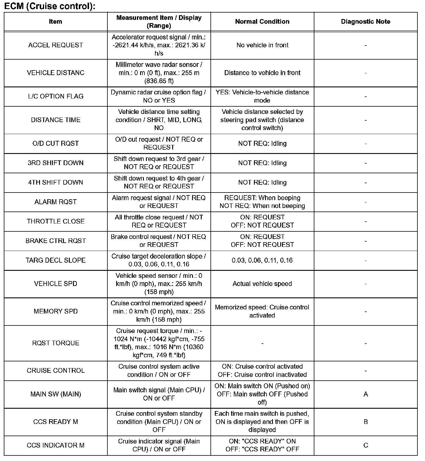 - A is OK, but CRUISE main indicator light does not illuminate --> Cruise main indicator light, wire harness, or ECM failure.