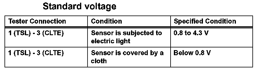 NOTE: The connection procedure for using a digital tester such as a TOYOTA electrical tester is shown above. When using an analog tester, connect the positive (+) lead to terminal 2 and negative (-) lead to terminal 1 of the solar sensor.