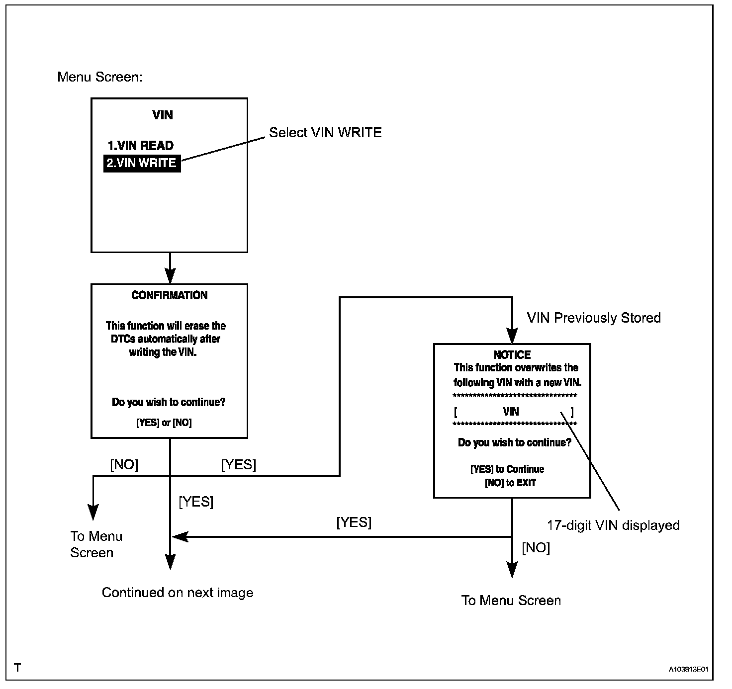 a. Explains the VIN writing process in a flowchart. This process allows the VIN to be input into the ECM. If the ECM is changed, or the ECM VIN and Vehicle VIN do not match, the VIN can be registered, or overwritten in the ECM by following this procedure.