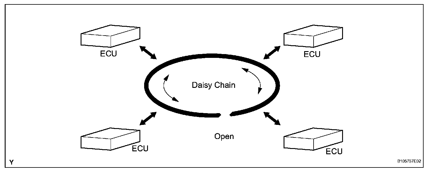 1. The BEAN uses a ring and bus style of network to connect ECUs. This style of communication method is called a daisy chain. In a daisy chain, communication can be maintained even if the network has an open circuit.