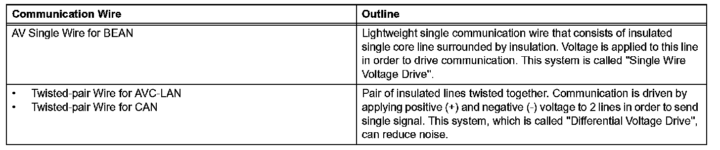 2. A single, Automobile Vinyl (AV) wire is used for BEAN communication. A twisted-pair wire is used for CAN and AVC-LAN communication.