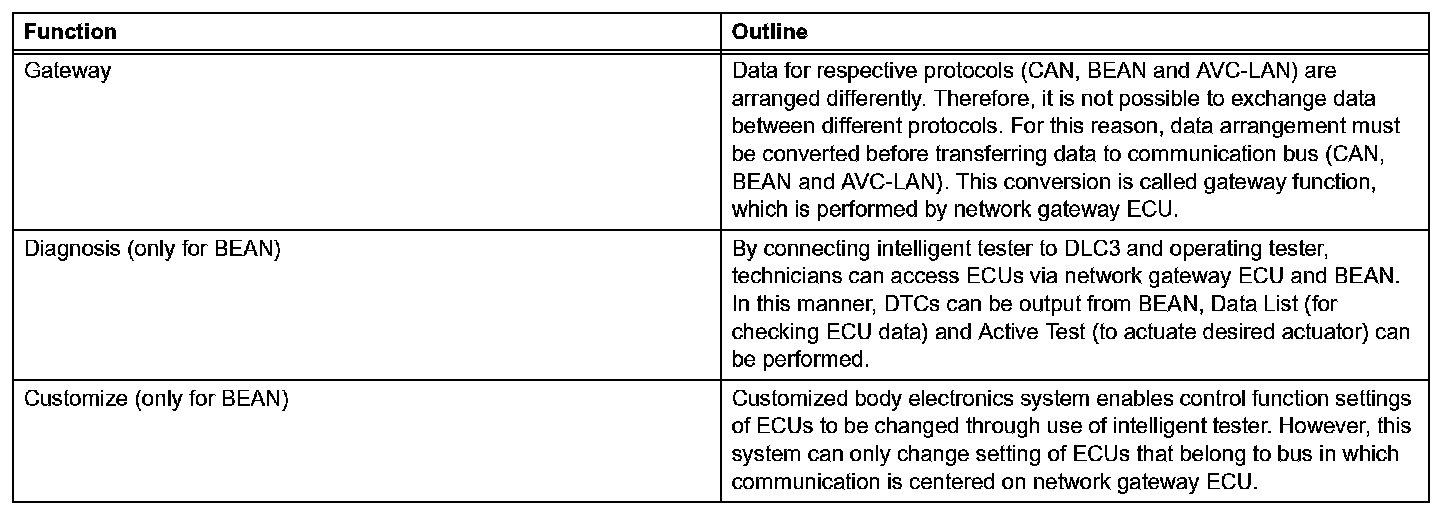 1. The CAN, BEAN and AVC-LAN protocols have set guidelines for data. The guidelines include communication speed, type of communication wire, drive type and data length. These guidelines are established to facilitate ECU data communication.