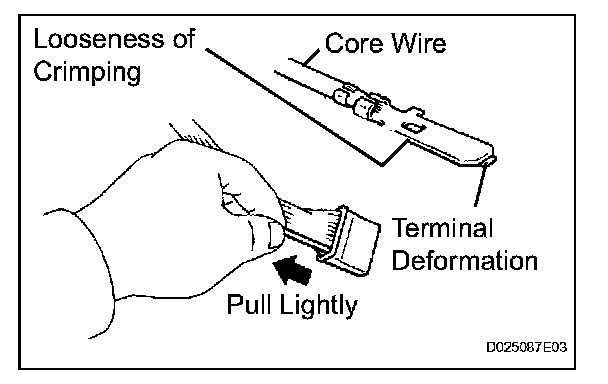 Check by pulling the wire harness lightly from the backside of the connector. Look for unlatched terminals, missing terminals, loose crimps or broken conductor wires. Check visually for corrosion, metallic or foreign matter and water, and bent, rusted, overheated, contaminated, or deformed terminals.