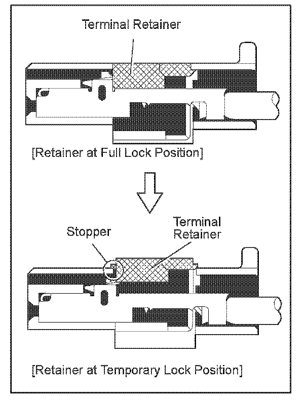 3. Insert the terminal with terminal retainer in the temporary lock position.