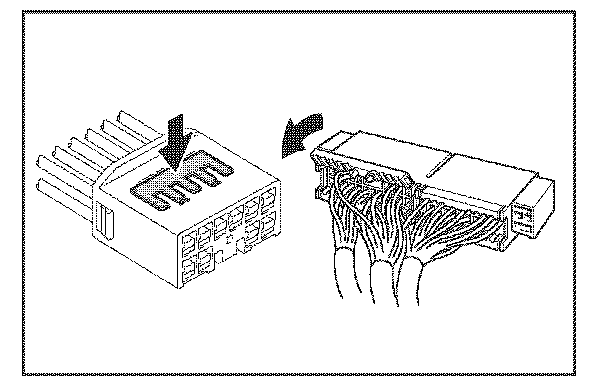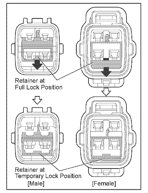Insert the special tool into the terminal retainer access hole (/\Mark) and pull the terminal retainer up to the temporary lock position.