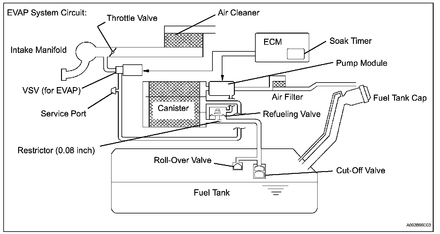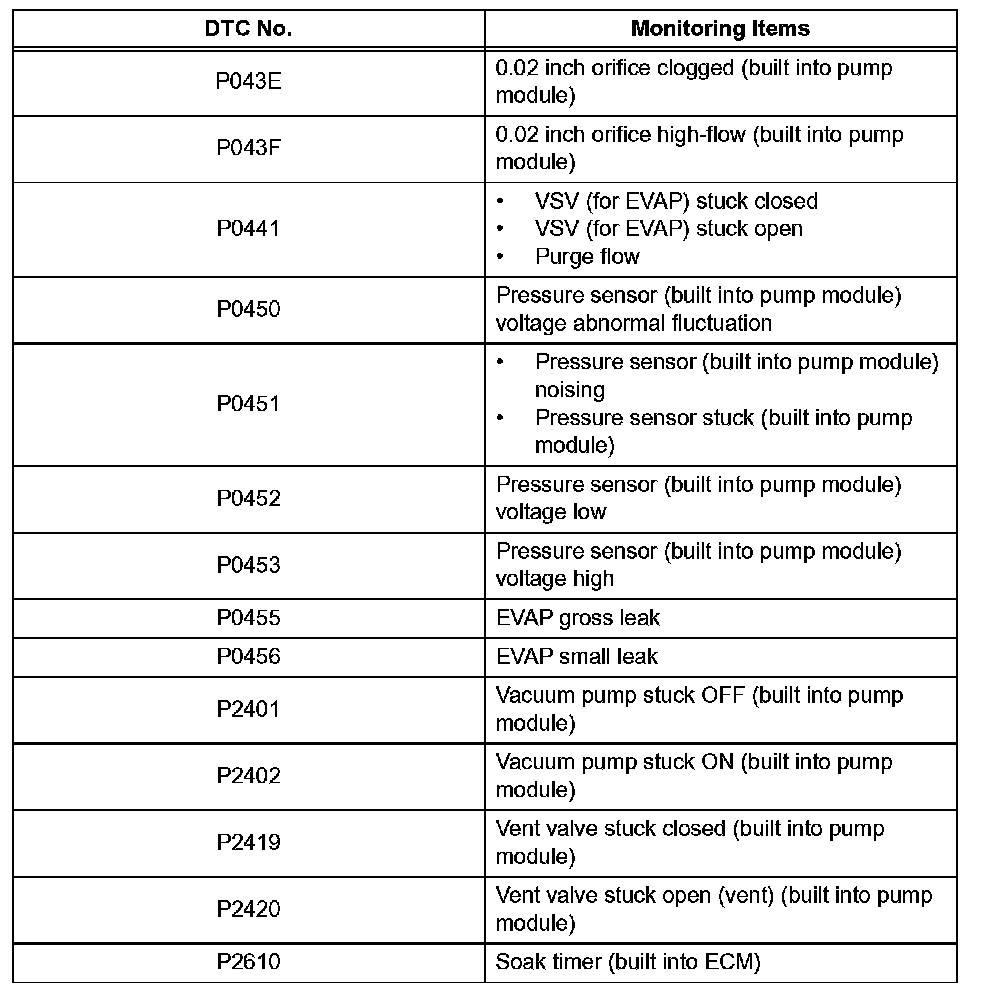 The electric vacuum pump creates negative pressure (vacuum) in the EVAP system and the pressure is measured. Finally, the ECM monitors for leaks from the EVAP system and malfunctions in both the pump module and VSV (for EVAP), based on the EVAP pressure.