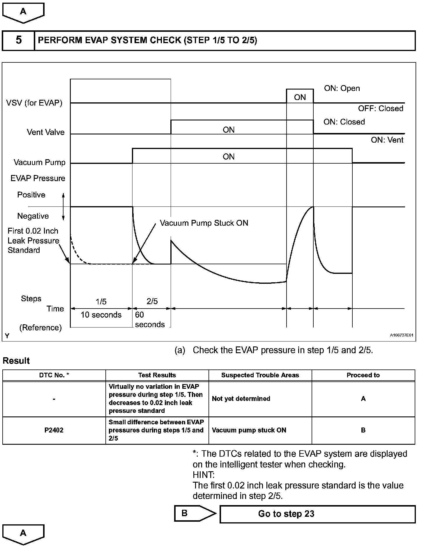 NOTE: If the 0.02 inch reference pressure difference between the first and second checks is greater than the specification, the DTCs corresponding to the reference pressure (P043E, P043F, P0441, P0455, P0456, P2401 and P2420) will all be stored.