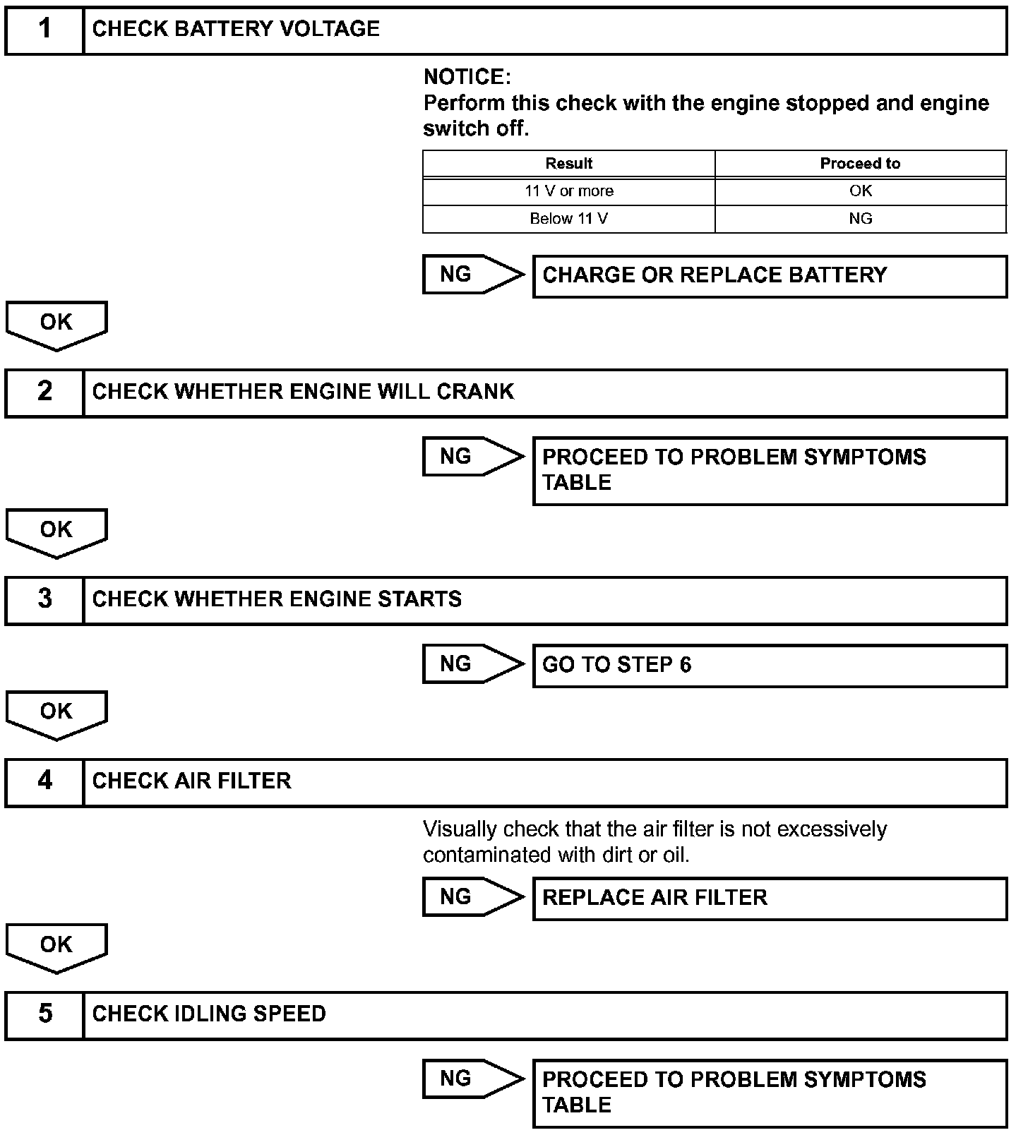 When the malfunction is not confirmed by the DTC check, troubleshooting should be carried out in all circuits considered to be possible causes of the problem. In many cases, by carrying out the basic engine check shown in the flowchart, the location of the problem can be found quickly and efficiently. Therefore, using this check is essential when engine troubleshooting.
