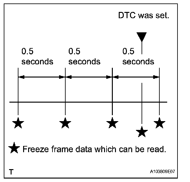 The ECM records engine conditions in the form of freeze frame data every 0.5 seconds. Using the intelligent tester, 5 separate sets of freeze frame data, including the data values at the time when the DTC was set, can be checked.