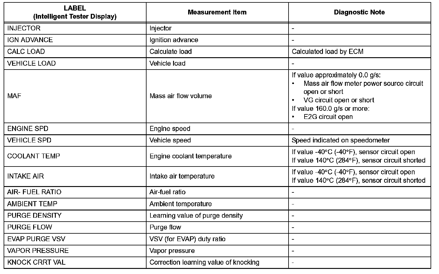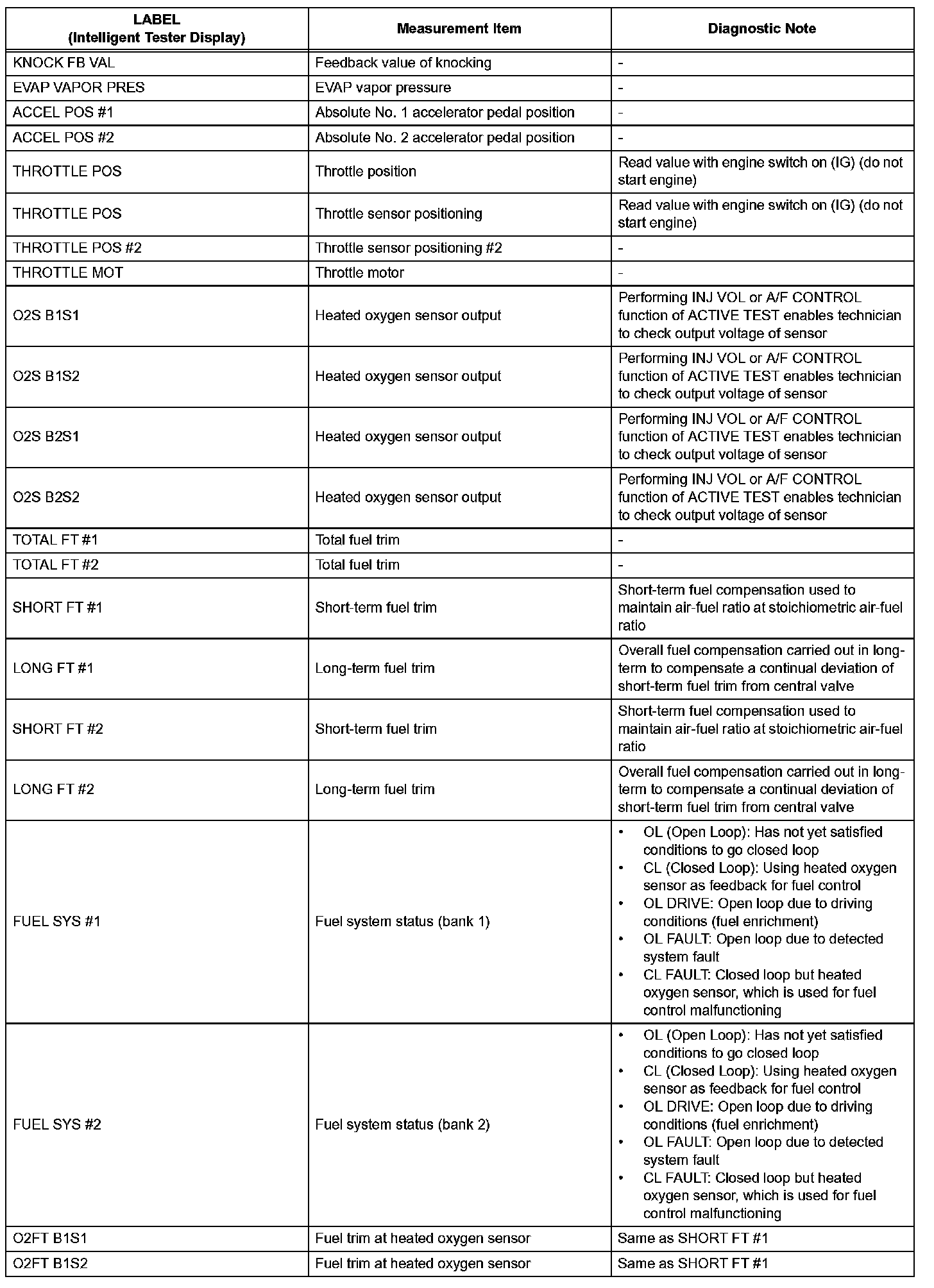 Freeze frame data records the engine conditions (fuel system, calculated load, engine coolant temperature, fuel trim, engine speed, vehicle speed, etc.) when a malfunction is detected. When troubleshooting, freeze frame data can help determine if the vehicle was running or stopped, if the engine was warmed up or not, if the air-fuel ratio was Lean or Rich, and other data from the time the malfunction occurred.