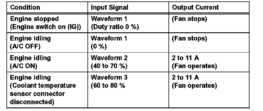 HINT: If the input signal is abnormal, there is a malfunction in the ECM or cooling fan ECU. If the output current is abnormal even when the input signal is normal, there is a malfunction in the cooling fan ECU (RFC) or motor.