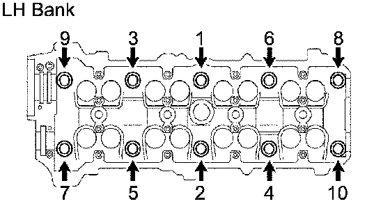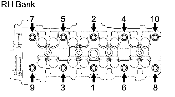 Install and uniformly tighten the 10 cylinder head bolts and plate washers in the sequence shown in the illustration.