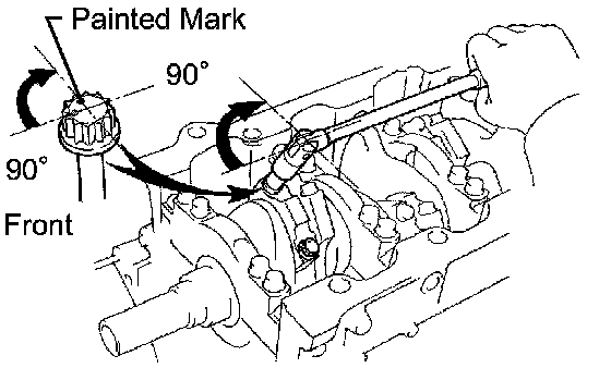 Retighten the crankshaft bearing cap bolts by 90° as shown in the illustration.