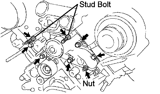 Install a new gasket and the water pump with the 5 bolts, 2 stud bolts and nut.