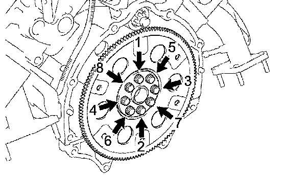 Install and uniformly tighten the 8 mounting bolts in several passes, in the sequence shown in the illustration.