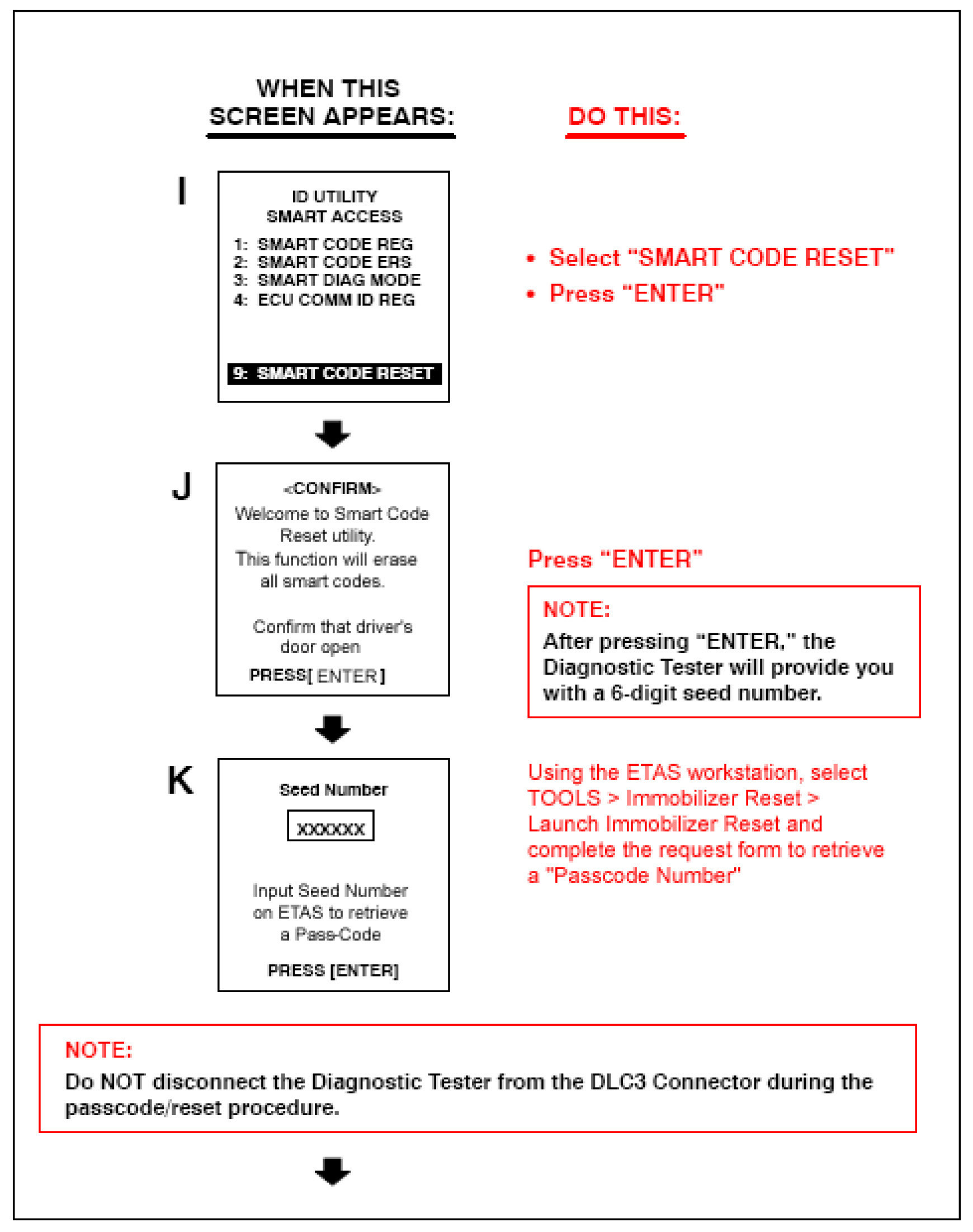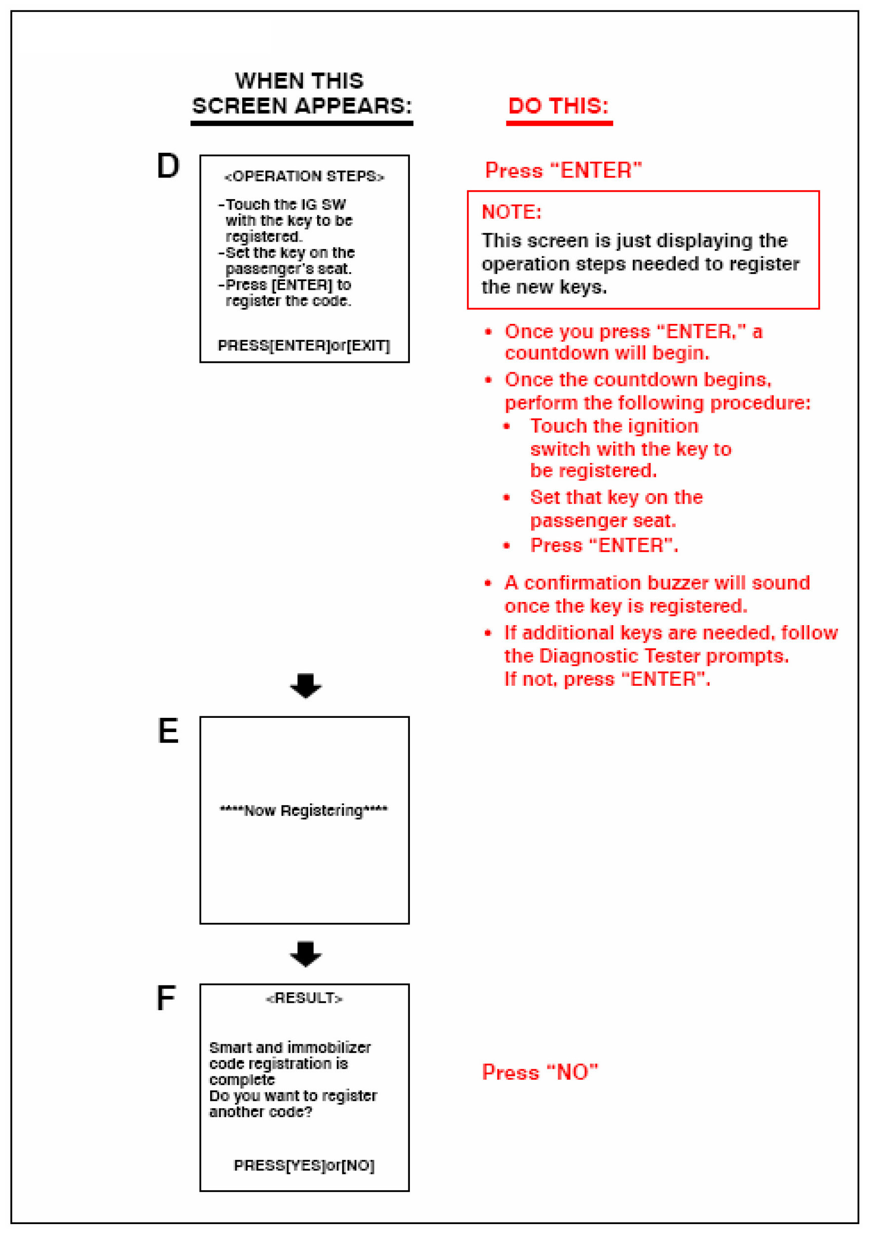 Follow the Diagnostic Tester screen flows. This procedure works best if you use the instructions under the "DO THIS" column and use the screen prints to know WHEN to perform the instructions only.