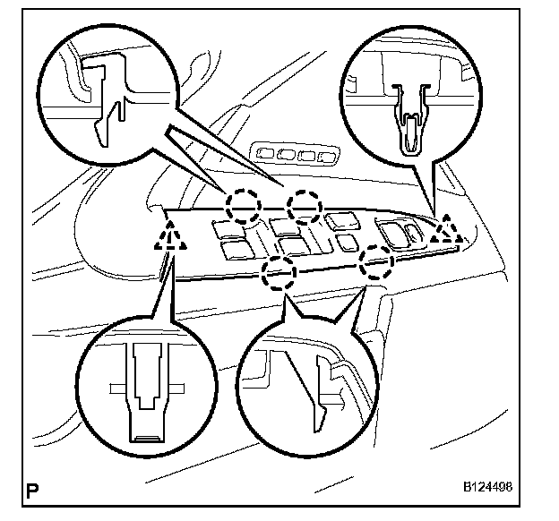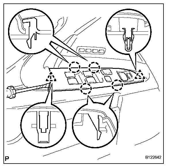 b. Engage the 2 clips and 4 claws, and install the power window regulator master switch assembly.