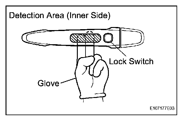 5. Step 5.Inspect the door electrical key oscillator's response sensitivity. Wear protective gloves, set the system to unlock standby mode, and check that touching the inner side of the outside handle (the highlighted area in the illustration) with your finger causes the door to unlock.