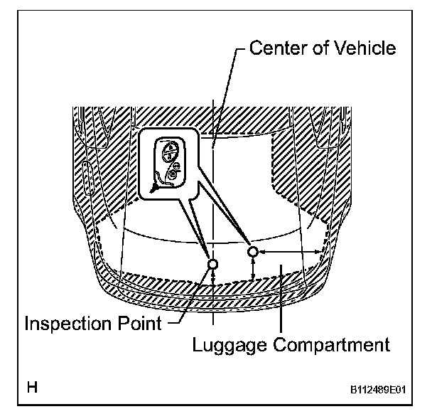 2. Inspect the electrical key lock- in prevention's detection area. Pay attention to the direction of the electrical key shown in the illustration. When the electrical key is in either of the 2 locations in the illustration, check that.1) closing the luggage compartment door sounds the electrical key's wireless buzzer, and 2) pressing the power luggage door open switch opens the luggage compartment door.