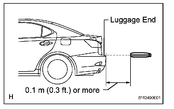 3. Inspect the electrical key lock- in prevention's detection area and the entry door control receiver for wave leaks. Hold the electrical key at the same height as the lower edge of the luggage compartment door and aligned with the center of the rear of the vehicle. Pay attention to the direction and position of the electrical key shown in the illustration. When the electrical key is over 0.1 m (0.3 ft) from the vehicle's rear bumper, check that the electrical key's wireless buzzer does not sound.