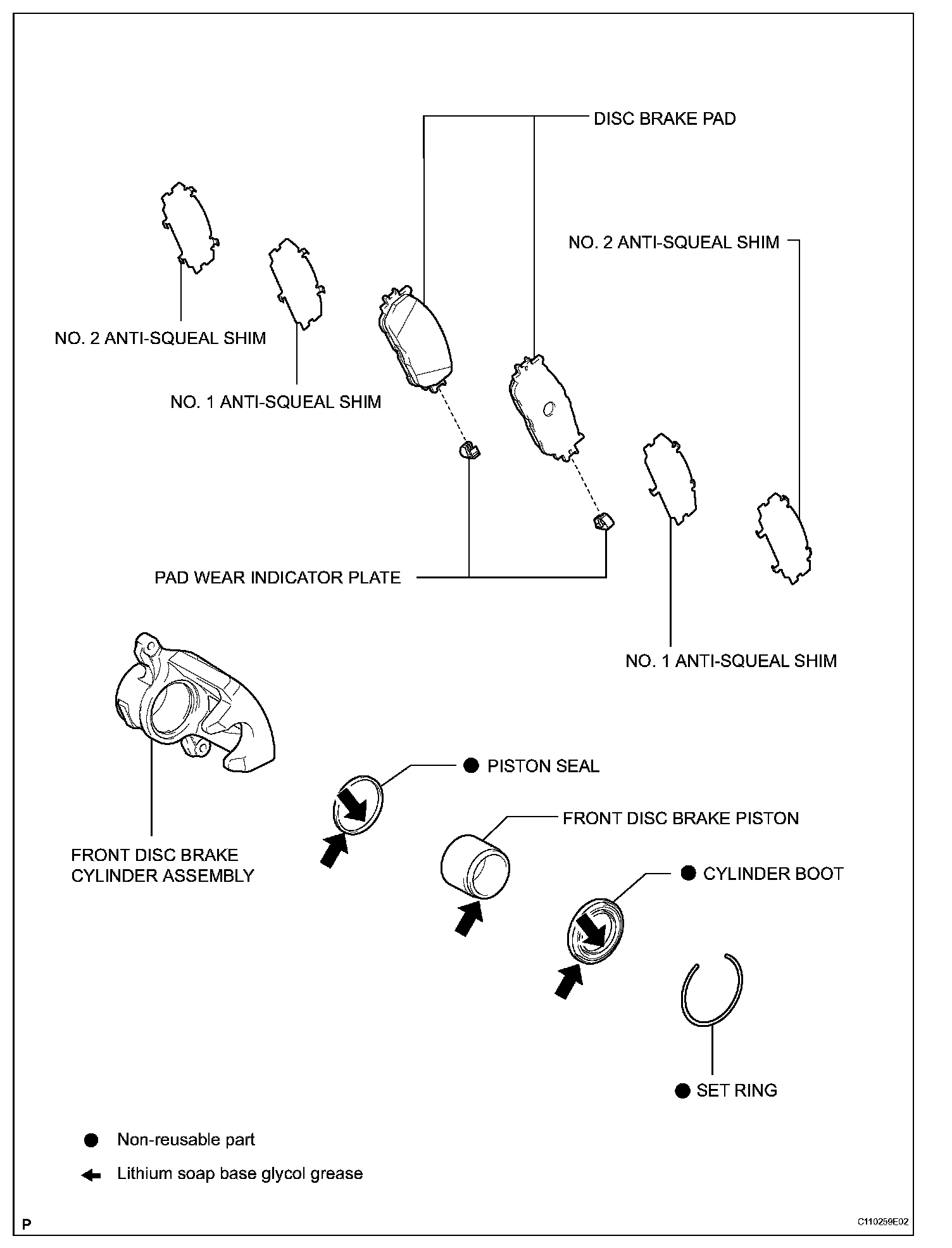 b. Install the 2 No. 2 anti-squeal shims to each pad.