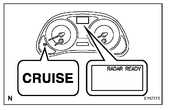b. Check that the CRUISE main indicator light and RADAR READY indicator come on when the main switch ON-OFF button is pushed on, and that the indicator light and the indicator go off when the ON-OFF button is pushed off.