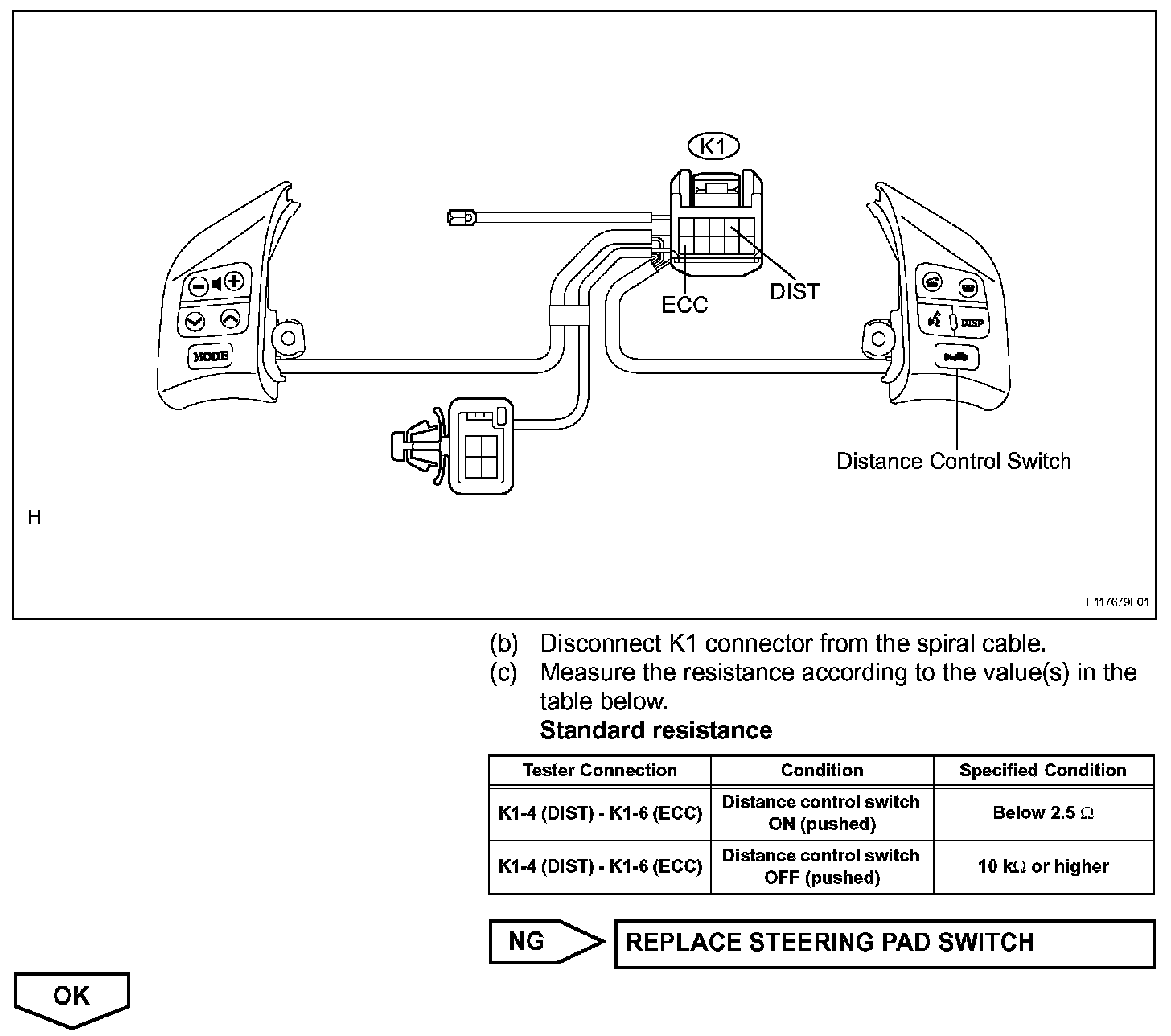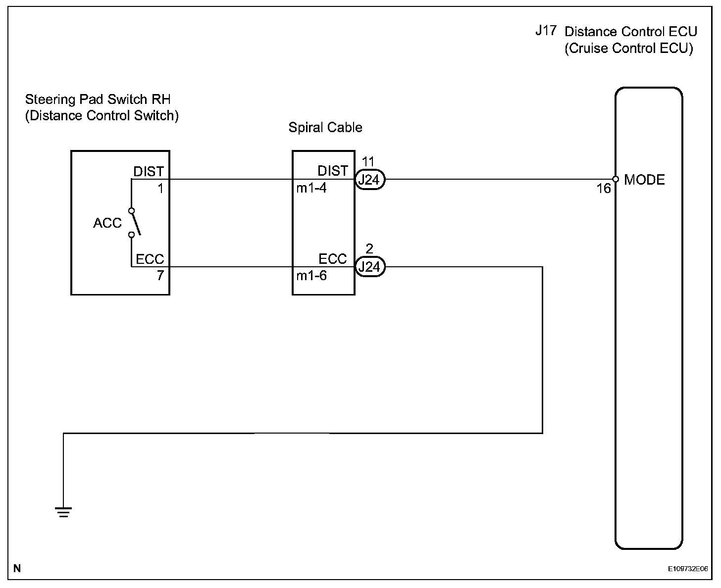 The distance control switch sets the vehicle-to-vehicle distance control mode. The distance control switch is installed in the steering pad switch. The vehicle-to-vehicle distance set value can be changed by operating the steering pad switch (distance control switch) while the dynamic radar cruise control system is in operation. The steering pad switch uses the BEAN to communicate with each ECU. Therefore, it does not have a direct connection with the ECM. If there are any malfunctions in the communication line of the steering pad switch, one or more DTCs in the multiplex communication system are output.