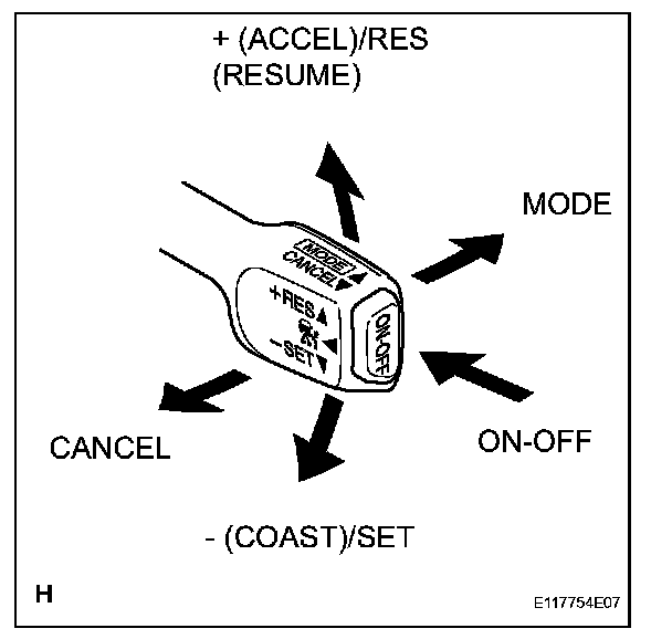 b. Check the cruise control main switch using the DATA LIST function in the intelligent tester (ON-OFF, CANCEL, - (COAST)/SET, + (ACCEL)/RES (RESUME), and MODE).