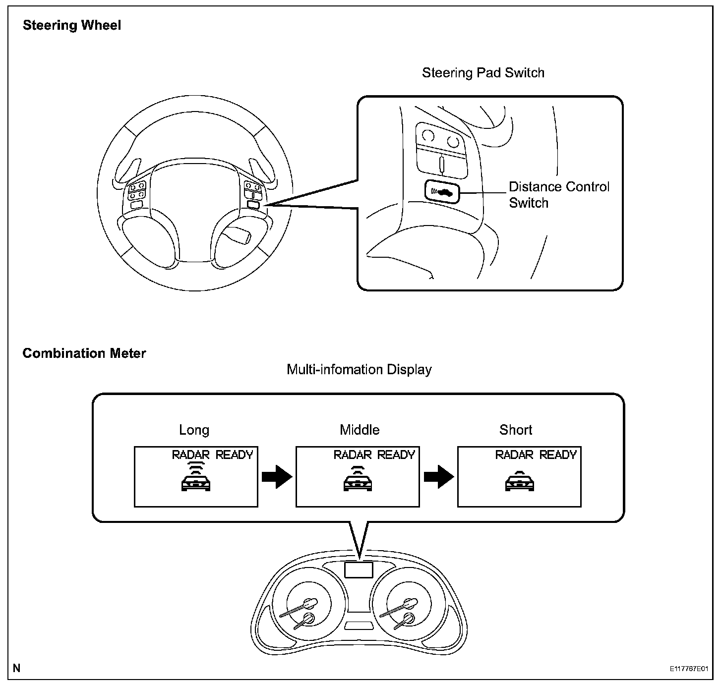 d. Check that the indication of the vehicle-to-vehicle distance, which is shown on the multi-information display on the combination meter, changes from long to middle to short in that order.